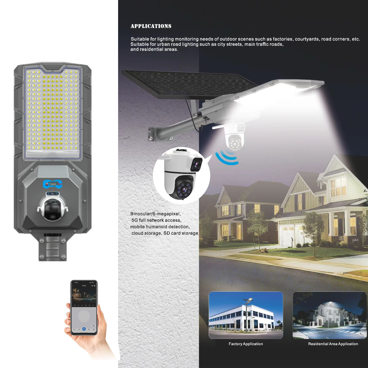 The Solar CCTV Street Light integrates lighting and security monitoring in one smart solution. It uses a safe and stable 3.2V lithium battery system and supports independent mobile APP control for real-time remote management. Available in both Wi-Fi and 4G versions for global use, it requires no wiring and is ideal for roads, villages, farms, construction sites, and other off-grid areas.